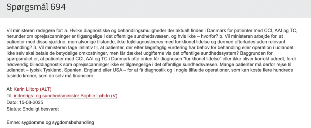 Ved at klikke på nedenstående kommer du til noget af den vigtigste dokumentation i denne samlede, ulykkelige situation. Her læser man nemlig et svar fra ministeren, Sophie Løhde, som ikke forholder sig til de mange danskere, der lider under sygdommen. Hun henviser blot til sin tillid til det danske sundhedsvæsen og peger på et tidligere svar. Læser man bilagene, bliver det ligeledes tydeligt, at sundhedssystemet i bund og grund ikke kan hjælpe på grund af en manglende diagnosekode, som ikke selvstændiggør lidelsen. Ligeledes oplyses det, at man faktisk opererer for sygdommen – men det gør man ikke. Det er faktisk ikke sandt.
